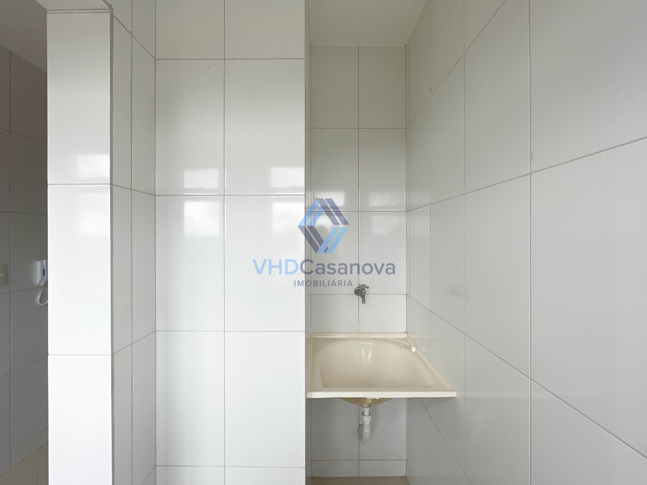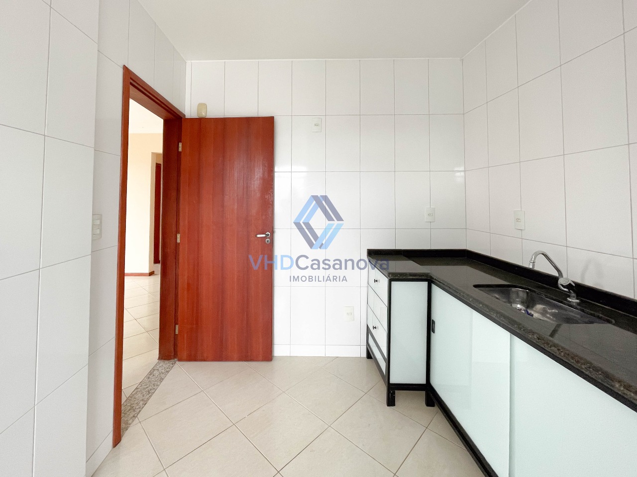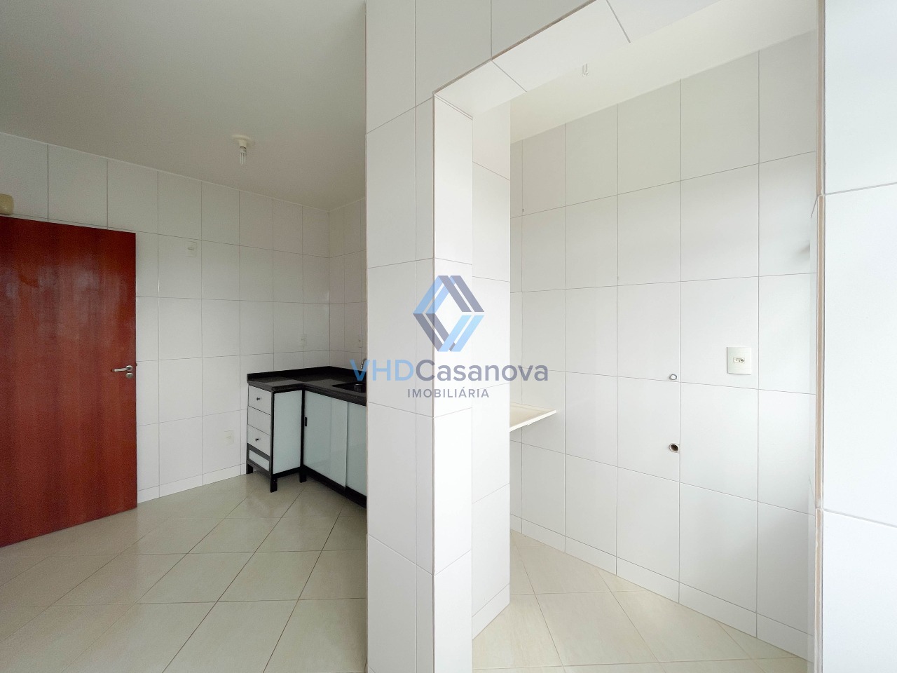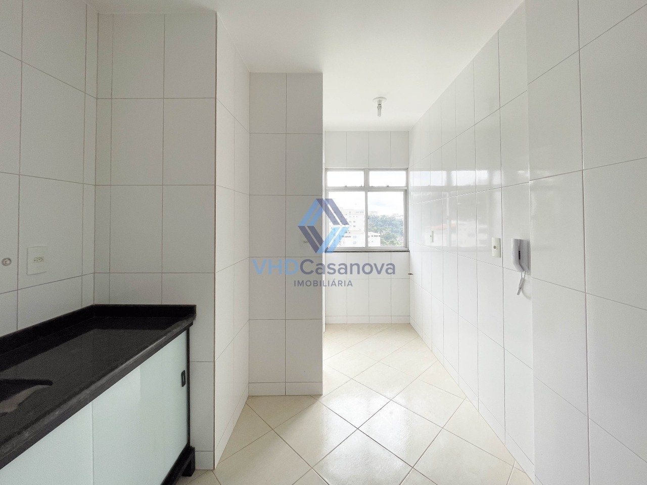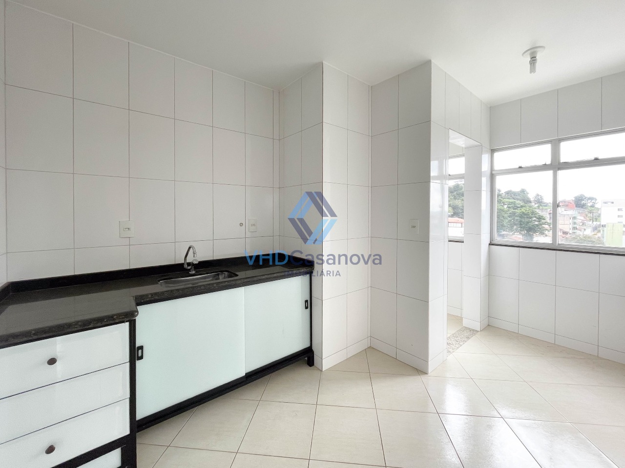 A cozinha é bem arejada e funcional, com ligação prática para a área de serviço.